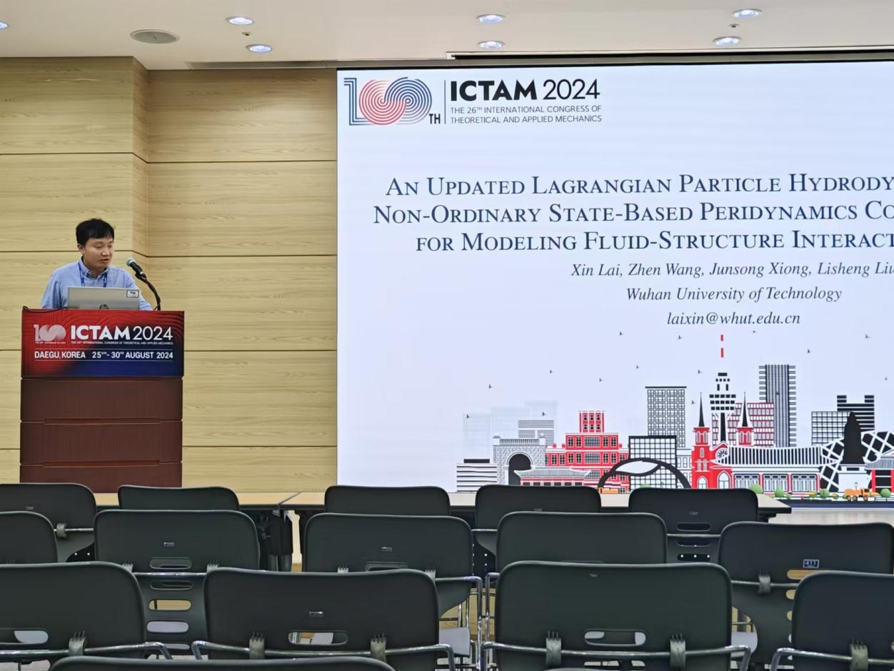 在本次大会上,武汉理工大学力学系老师受邀参会并代表新材料力学理论与应用湖北省重点实验室报告了威廉体育williamhill在更新拉格朗日粒子水动力学(ULPH)及近场动力学(PD)在流-固耦合和高雷诺数湍流的算法理论等方面的研究新进展。在第FS05分论坛“FLUID STRUCTURE INTERACTIONS”上,赖欣副教授作了题为“AN UPDATED LAGRANGIAN PARTICLE HYDRODYNAMICS (ULPH)-NON-ORDINARY STATE-BASED PERIDYANMICS COUPLING APPROACH FOR MODELING FLUID-STRUCTURE INTERACTION PROBLEMS”的口头报告,刘翔老师作了题为“TURBULENT FLOW SIMULATION WITH LES-WALE MODEL USING THE PERIDYANAMIC DERIVATIVE OPERATOR”的带海报简短报告。报告后,与会专家学者对武汉理工大学近年来以ULPH和PD为代表的计算流体动力学所做的理论基础研究和预测工作给予了肯定和赞扬,并就算法实现等细节学术问题积极展开了交流讨论。