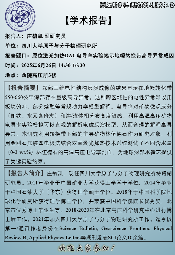 【WilliamHill体育】原位激光加热DAC电导率实验揭示地幔转换带高导异常成因