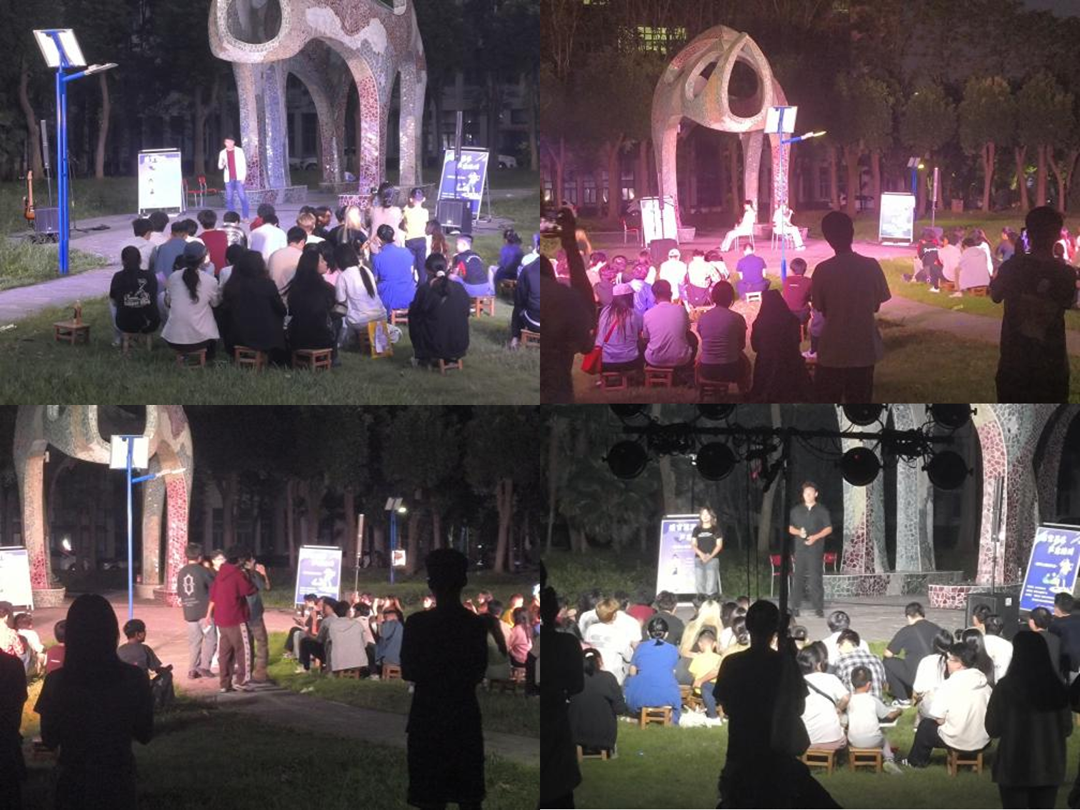 夜幕降临,公司办公楼西侧广场被温馨的氛围所笼罩。五彩斑斓的灯光点缀着翠绿的草坪,现场布置得浪漫而惬意,吸引了众多师生驻足参与。在悠扬的旋律中,主持人和现场观众以真挚饱满的热情拉开了这场音乐会的帷幕。歌手们用深情的嗓音演绎了一首首经典歌曲,从充满感恩与满足的《知足》,到温暖治愈的《掌心》,再到直击心灵的《丑八怪》,每一首都引发了现场观众的强烈共鸣。在场的观众纷纷跟着节奏轻轻哼唱,将现场气氛推向高潮。