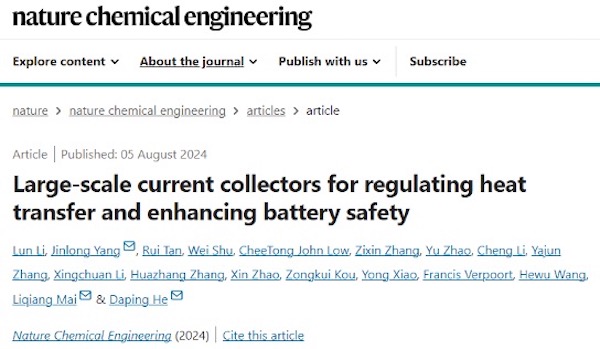 Lun Li#, Jinlong Yang#*, Rui Tan#, Wei Shu#, CheeTong John Low, Zixin Zhang, Yu Zhao, Cheng Li, Yajun Zhang, Xingchuan Li, Huazhang Zhang, Xin Zhao, Zongkui Kou, Yong Xiao, Francis Verpoort, Hewu Wang, Liqiang Mai*, Daping He*, Large-scale current collectors for regulating heat transfer and enhancing battery safety, Nature Chemical Engineering.