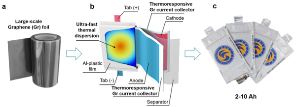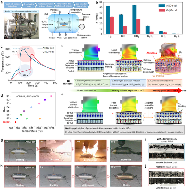 该研究针对当前电动车、电动汽车中锂离子电池频繁起火带来的燃烧、爆炸等安全隐患,开发了一种具有超高电导率和热导率的新型集流体Gr,以取代传统电池中的Al箔和Cu箔,成功制备了一种具有快速散热能力且在极端针刺下不起火的高安全性锂离子电池。通过XRD、Raman、SEM、应力-应变曲线等测试系统地表征了Gr的微观结构和物理化学性质,论证了其作为集流体的可行性。进而再通过产业线上参数调试和焊接技术的改进实现了软包电池的批量化制备。利用一系列电化学测试研究了组装的Gr||Gr软包电池在能量密度和循环稳定性方面的优势。最后结合一系列的热实验表征和理论模拟深入探讨了Gr对电池安全性提升的机理。因此,该研究将为高安全和高能量密度锂离子电池的设计提供新的理论见解,推动当前动力电池和大规模储能系统的安全性创新。
