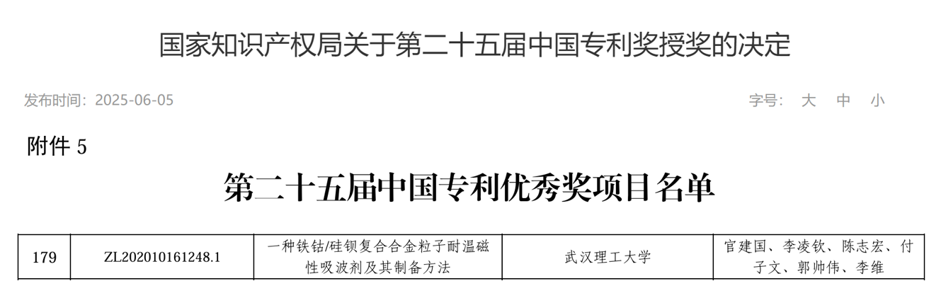 发布时间:2025-06-24近日,国家知识产权局针对在实施创新和推动经济社会发展等方面作出显著贡献的专利权人、发明人(设计人)以及相关组织者给予表彰。公司青年教师陈志宏教授作为核心骨干的专利“一种铁钴/硅钡复合合金粒子耐温磁性吸波剂及其制备方法”获第二十五届中国专利优秀奖。目前,陈志宏教授已有9项国家发明专利分别在武汉双虎涂料股份有限公司、武汉心电科技有限公司、武汉康泰威科技有限公司等多家企业实现成果转化,并入选湖北省经信厅第五批“科技副总”,助力区域经济发展